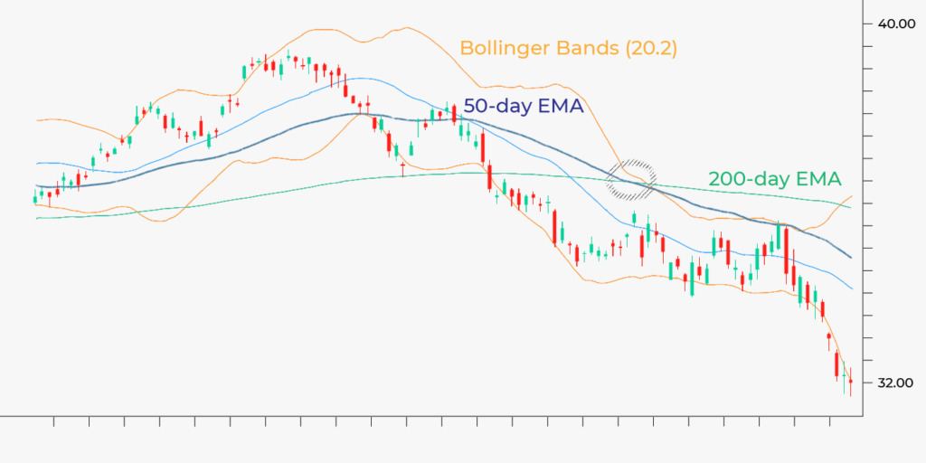 Moving averages examine the price movement in the past over set time frames, dividing the sum to get a consistent average that is adjusted with every new bar. Compared to their more well-known sibling, the SMAs (simple moving averages), the 50- and 200-day EMAs are more responsive. In essence, the 200-day indicator monitors the average long-term price of an asset, whereas the 50-day EMA reflects the average interval price.
