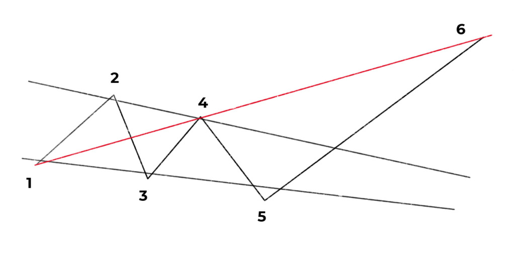 ऐसा करने के लिए, लहर 1 पर शुरुआत को तरंग 4 के शुरुआती बिंदु से कनेक्ट करें और इस लाइन को तब तक प्रोजेक्ट करें जब तक कि यह एक बिंदु (लहर 6) पर कीमत से नहीं मिलता । यह तेजी और मंदी दोनों पैटर्न पर लागू होता है। यह ध्यान रखना महत्वपूर्ण है कि वोल्फ पैटर्न में व्यापार से बाहर निकलने का कोई सटीक बिंदु नहीं है।