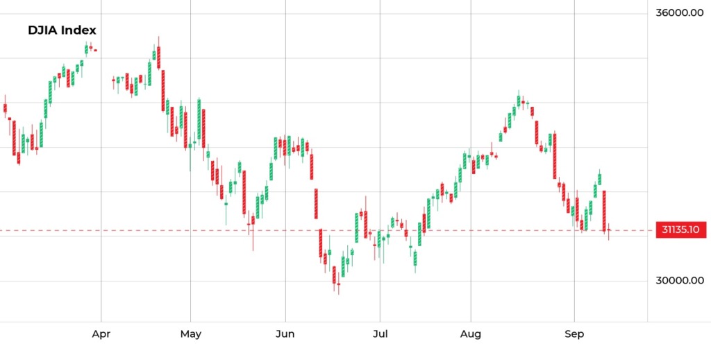 यह सूचकांक संयुक्त राज्य अमेरिका में 30 सबसे बड़े ब्लू-चिप शेयरों के मूल्य को मापता है।