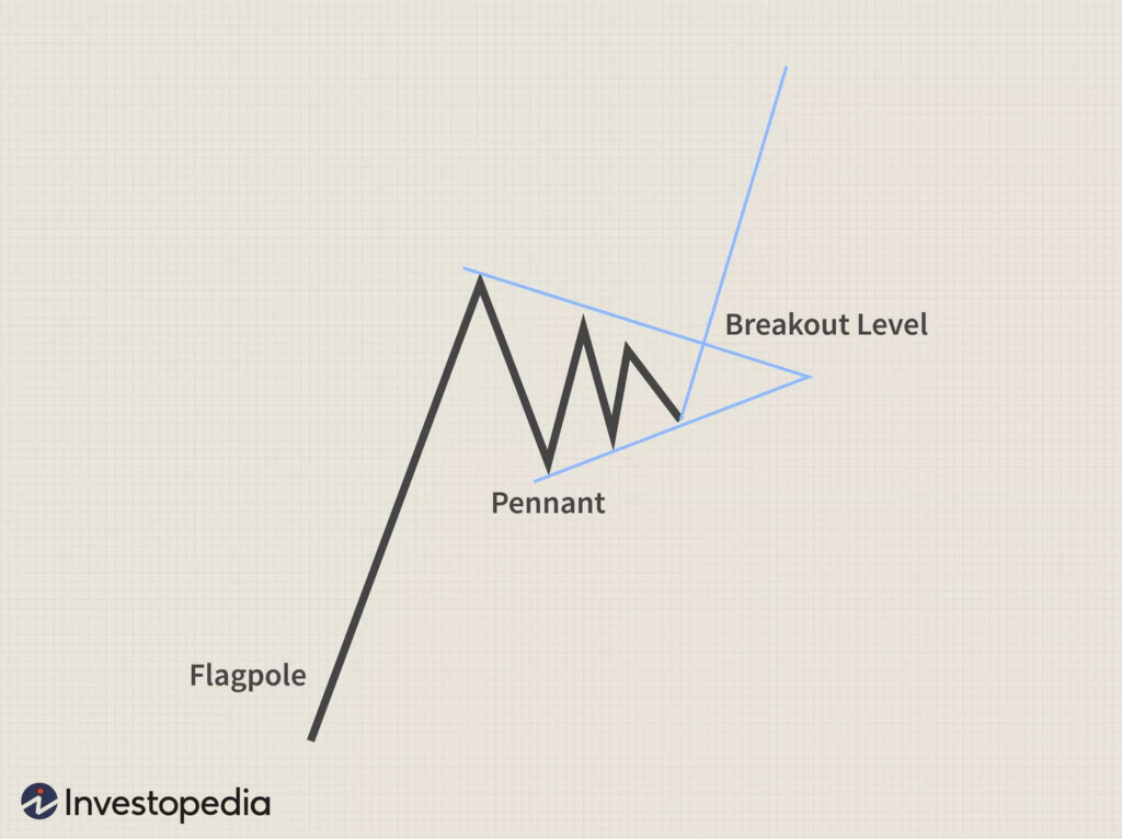 A pennant is a sort of continuation pattern used in technical analysis that develops when an asset experiences a major movement, or the flagpole, following a consolidation phase with convergent trend lines (or the pennant) and then a breakout in the same trend as the earlier big movement, or the second quarter of the flagpole.