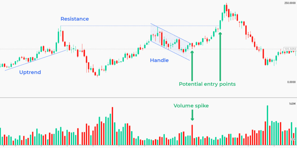 Setelah ada breakout  pada level ini, titik masuk akan dikonfirmasi. Disisi lain, beberapa trader menggunakan penembusan handle trendline sebagai entry point untuk posisi long.