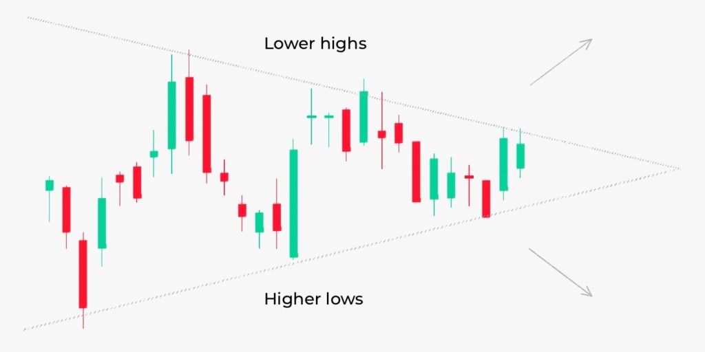 These are continuation patterns. You expect a breakout on the side of the stronger trend as the trendlines converge. This pattern resembles a funnel and takes a few months to form fully.