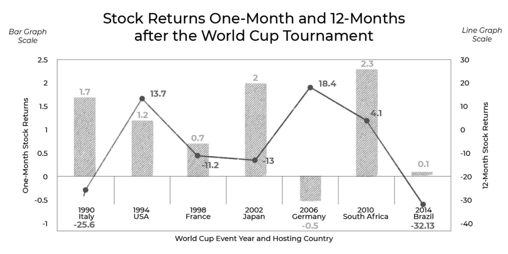 Os eventos da copa do mundo de 2006, 2010, 2014 e 2018 foram organizados pela Alemanha, África do Sul, Brasil e Rússia, respectivamente. Com base na análise de mercado, nos 20 dias anteriores ao anúncio dos anfitriões da Copa do Mundo, os principais mercados da Alemanha e da África do Sul experimentaram um declínio no Retorno Anormal Médio Cumulativo (CAAR). Em contraste, os mercados sul-africanos experimentaram uma tendência ascendente positiva nos 20 dias após o anúncio, enquanto a Alemanha experimentou um ganho em mais de cinco dias após o anúncio.