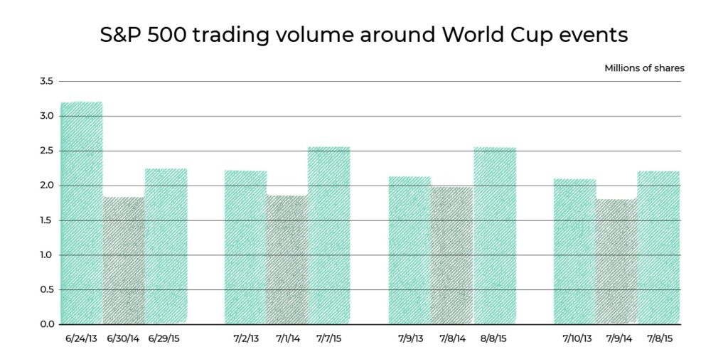 A pesquisa mostra que os volumes de negociação caem durante as partidas, perceptível com a atividade de negociação no país anfitrião quando o time joga durante o horário de mercado. Os traders tendem a prestar menos atenção ao mercado e respondem mal a notícias relevantes quando um jogo está em andamento.
