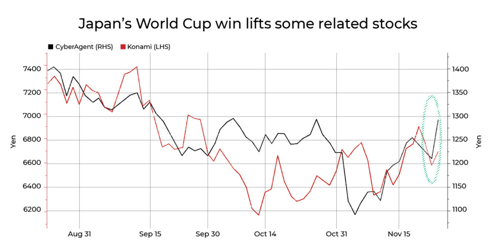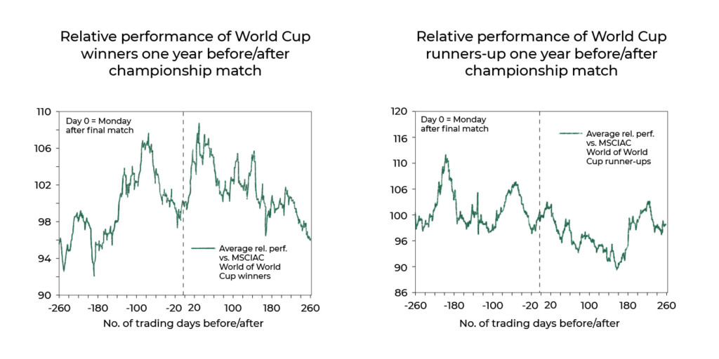 De acordo com um relatório do Goldman Sachs, os vencedores experimentam um impulso de curta duração no mercado nos próximos meses. Isso permaneceu o mesmo em todas as copas do mundo, exceto na vitória do Brasil em 2002, onde o mercado permaneceu uma mar de problemas.