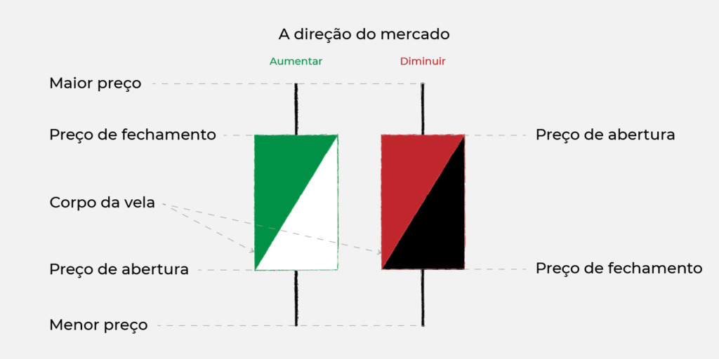 • A cor da vela revela a direção do mercado: vermelho ou preto mostra uma queda no preço, enquanto verde ou branco mostra um aumento