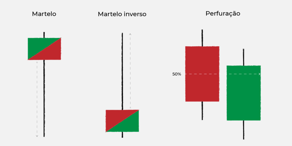 O martelo têm um corpo curto com um longo pavio na parte inferior, geralmente encontrado em uma tendência descendente. Os martelos sugerem que, mesmo que houvesse pressões de venda ao longo do dia, com as pessoas originalmente não comprando, uma forte pressão de compra finalmente apareceu e fez os preços subirem. As cores podem variar, mas o verde é considerado um dos melhores padrões de velas.