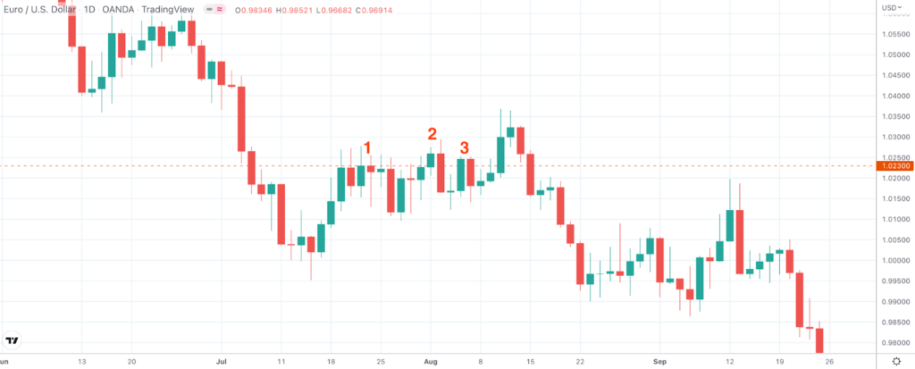 Observe o gráfico acima. O preço do par EUR/USD se recuperou do nível de US$ 1,0230 várias vezes (1). Mais tarde, o preço foi um pouco além disso (2). No entanto, ainda estava perto de US$ 1,0230. Depois, o EUR/USD parou perto de US$ 1,0230 novamente (3).