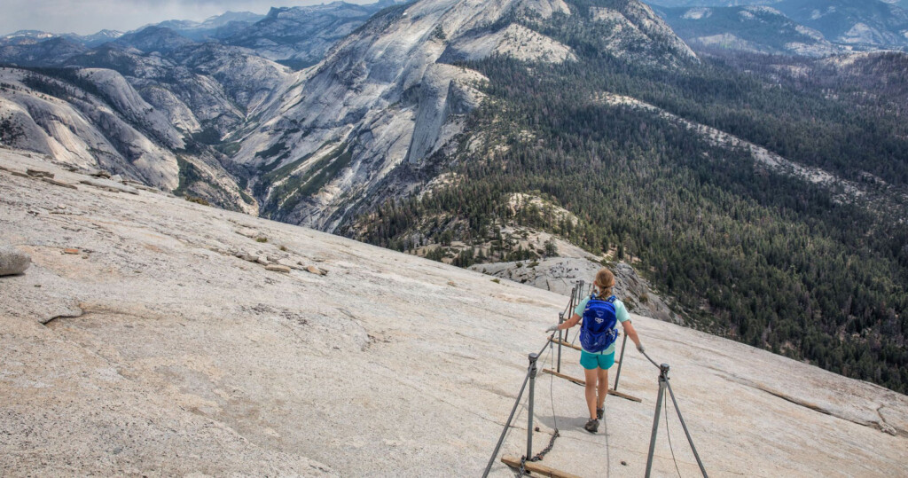 Half Dome Trail is a popular hiking trail located in Yosemite National Park, California, USA. The trail is approximately 22-26 km (14-16 miles) round trip and it takes on average 12-14 hours to complete. The trail starts at the Happy Isles trailhead in Yosemite Valley, and it goes through beautiful landscapes, including forests, waterfalls, and granite cliffs, before reaching the highlight of the trail: Half Dome, a granite dome that rises over the valley floor.