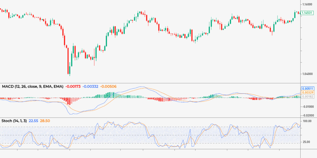Aşağıdaki grafikte Stokastik ve MACD indikatörlerinin kombinasyonunu görebilirsiniz. Grafikten de görebileceğiniz üzere her iki indikatör de birbirlerini doğruluyor ve fiyat hareketinin tersine dönme olasılığına dair sinyal veriyor.