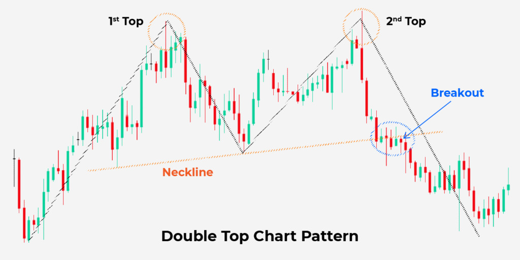 İki tepe arasındaki çukurdan yatay bir çizgi (boyun çizgisi) çizin. Fiyatın boyun çizgisinin altında kapanması gerekir. Kâr alma hedefiniz, üstler ile yaka arasındaki mesafeye eşit olacaktır. Ancak, desen başarısız olabilir. Bu nedenle, boyun çizgisinin üzerinde bir dur emri vermelisiniz. Dur emrinin seviyesi, fiyat değişkenliğine bağlıdır. Çok değişken piyasalarda bu seviyeyi çok yakına koymayın.