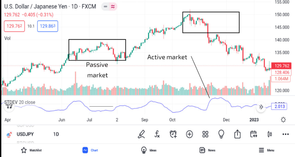 Küresel piyasa işlemlerinde varlıklar değişken ve likiditedir. Bu nedenle tüccarlar standart sapma indikatörünün ana fikrini ve grafikleri piyasa oynaklığına duyarlı hale getirmek için tamamlayıcı indikatörleri nasıl kullanacağını bilmelidir. Bunun içinde fiyat trendinde ani yükseliş olduğu anlar ve tüccarın pozisyonu açması/kapatması gereken anlar da vardır.