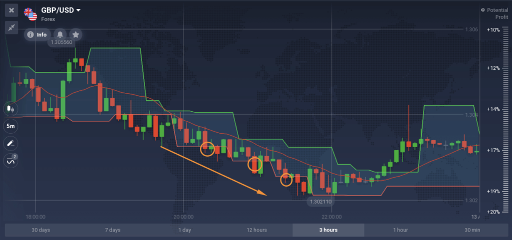 • Bantların eğimi, piyasa eğilimini belirlemede önemli rol oynar. Piyasa eğilimliyken, indikatör belirgin bir eğim sergiler. Bu da fiyatların açık yönlü hareketini gösterir.