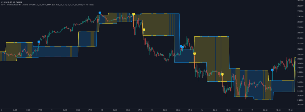 Üst bant, fiyat zirvelerini birbirine bağlanması ile, alt bant ise fiyat diplerini birbirine bağlanması ile oluşur. Sonuç olarak, bantlar temelde fiyat grafiğinin hareketini takip eder. İndikatör, fiyat gürültüsünü düzleştirir ve yalnızca önemli fiyat hareketlerine odaklanır. Bu bantları gözlemleyerek, tüccarlar piyasanın eğilimli bir aşamada olup olmadığını kolayca anlayabilir.