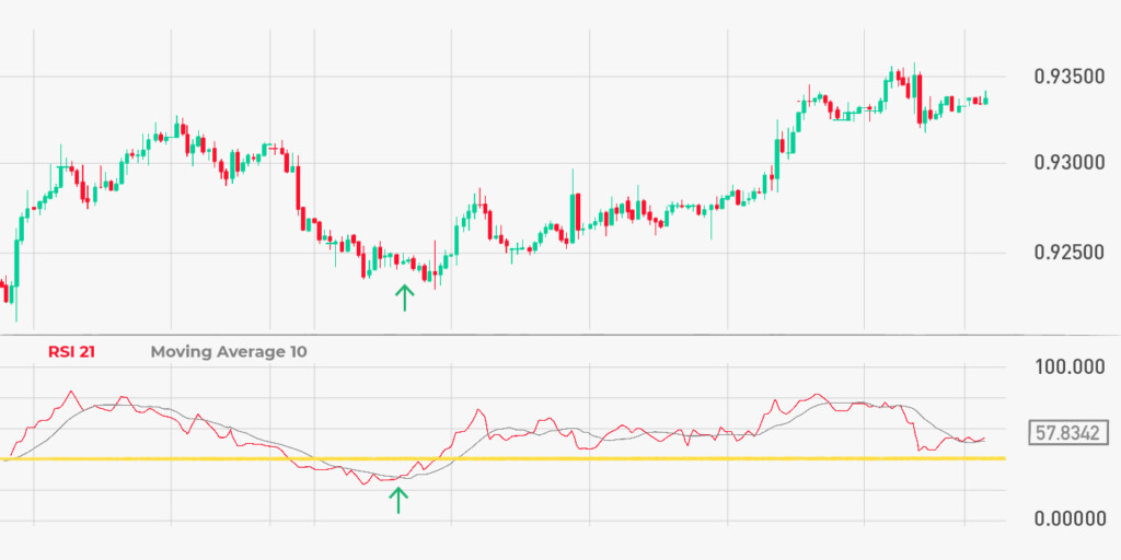 RSI’a baktığınızda işlem sırasında önemli sinyaller sağlayan çok yönlü bir indikatör olduğunu görürsünüz. İşlem yaparken tüccarlar RSI geçiş (crossover) sinyallerinden faydalanmak için RSI’a hareketli ortalama (MA) uygulamalıdır.