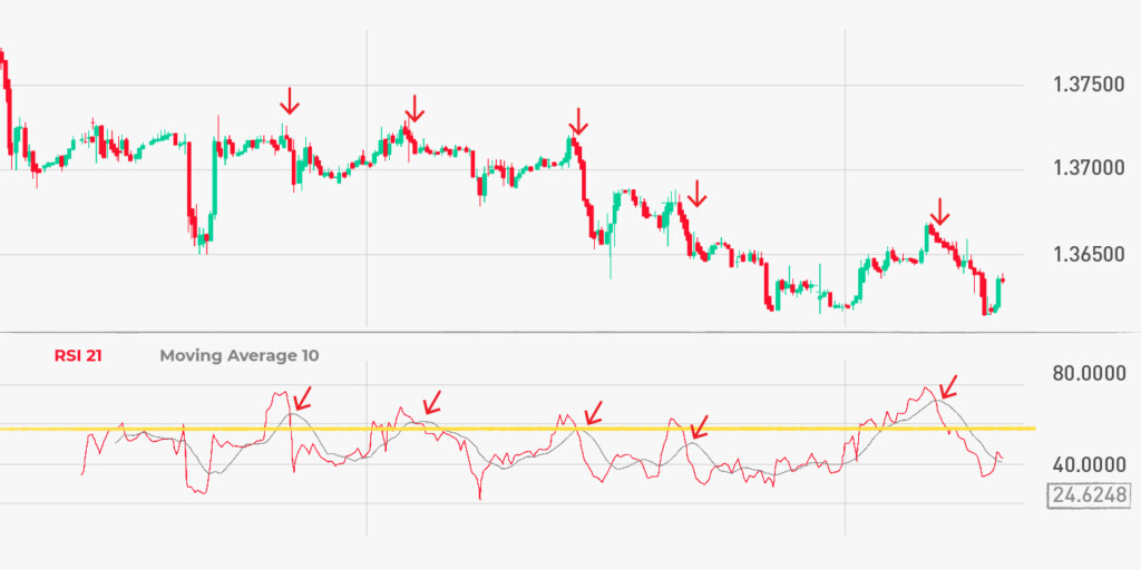 RSI geçişi hareketi 60’ın üzerine çıktığında bu geri çekilme demektir. RSI 60 işaretini (sarı yatay çizgiler) üzerine yönelince bir sonraki RSI kırmızı çizgisi fiyat hareketli ortalamasının (beyaz çizgi) altına düştüğünde tüccarların satış yapması beklenir.