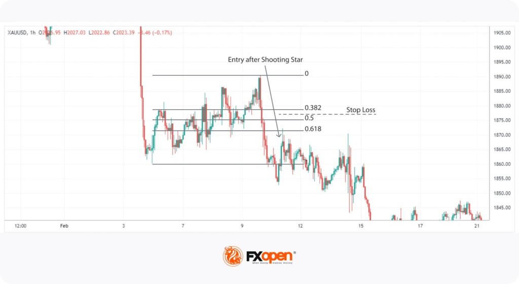 Fiyat, %38.2, %50 veya %61.8 seviyelerine yaklaştığında, olası bir geri dönüş sinyali ararsınız. Bu noktada çekiç (hammer) ve kayan yıldız (shooting star) gibi mum çubuğu formasyonları devreye girer. Bunlar yön değişikliklerini tespit etmek için kullanılabilen basit ama etkili araçlardır. Mum formasyonu onaylandığında, potansiyel bir giriş noktası elde etmiş olursunuz.