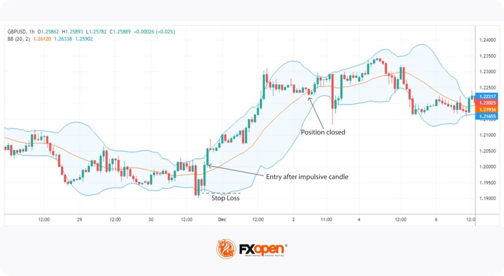 Bu güçlü mumu gördüğünüzde, işlem yapmaya hazırlanma vakti gelmiştir. Güvenlik ağınızı (zararı durdur emri) nereye koyacağınıza karar vermenin birkaç yolu var: Güçlü mumun hemen üzerine veya altına, hatta Bollinger Bantlarının dışına koyabilirsiniz. Genellikle tüccarlar, fiyatın ortalama çizginin üzerine veya altına geri dönmesi durumunda işlemi kapatırlar.