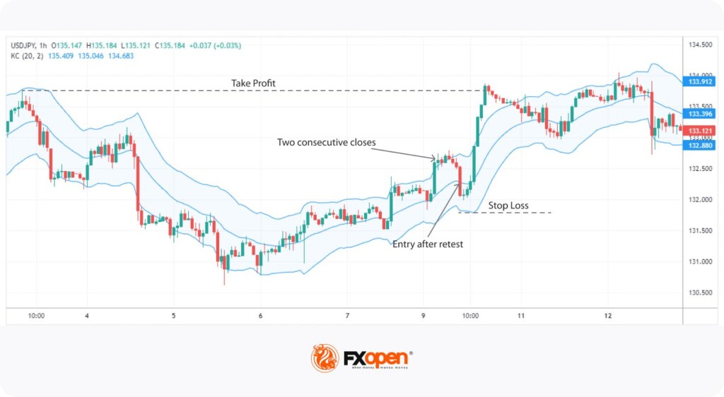 Trend takip etmeyi amaçlayan swing tüccarlar için, Keltner kanalları çok faydalı ve avantajlıdır. Güçlü bir trend belirledikten sonra, giriş noktalarınızı belirlemek için bu kanalları kullanabilirsiniz. İndikatörü 20 ATR uzunluğu ve 2 çarpanı kullanarak ayarlayın. Ardından, kapanış fiyatlarının iki ardışık dönem boyunca kanalın kenarlarını aştığı yerleri izleyin. İki kapanış gördüğünüzde, fiyatın üssel hareketli ortalama çizgisine dokunmak için geri çekildiğini gözlemleyin. Fiyat bu çizgiye değdiğinde, harekete geçme zamanıdır.