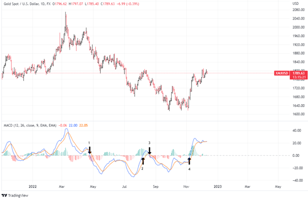 Yukarıdaki grafikte zaman diliminde toplamda dört sinyal bulunuyor. Bunların üçü teorik olarak olumlu işlemler sağlayabilirdi. MACD hattının ve sinyal hattının kesişmesiyle pozisyon almak işleme daha erken girmenize yardımcı olabilir ancak MACD’nin sıfır çizgisinin üzerine ve altına çıkılmasını beklemek, bir trendin varlığından emin olmanıza ve (umarız ki) işlemlerinizi sınırlı tutmanıza yardımcı olur.