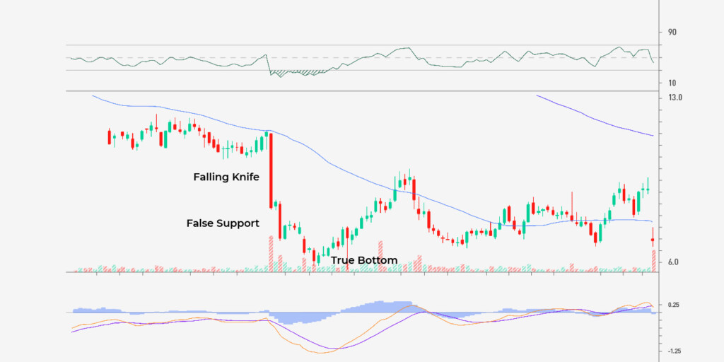 Bu örnekte yatırım, 50 günlük hareketli ortalamasından uzaklaştıktan sonra düşen bir bıçak oluşturuyor. Düşen bu bıçağı yakalamaya çalışan yatırımcılar 8,5$ civarında bir satın alma emri verebilirler, ancak fiyat dipten önce 6,0$ civarına indiğinde yatırımlarının bir kısmını kaybederler.