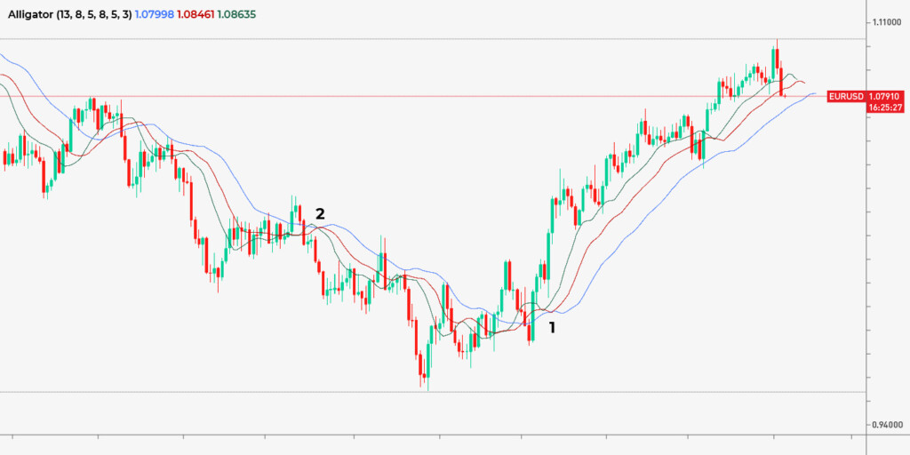 En hızlı SMMA, diğer hareketli ortalamaların üzerinde kırıldığında, satın al sinyali verir (1), timsah burada fiyatin yükseliş trendinde hareket edeceğini gösterir. En hızlı SMMA, diğer hareketli ortalamaların altında düştüğünde, sat sinyali verir (2), indikatör bu noktada tüccara, fiyatın düşüş trendinde hareket edeceğini söyler.