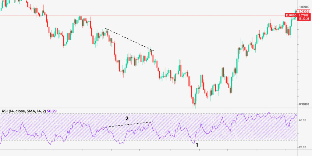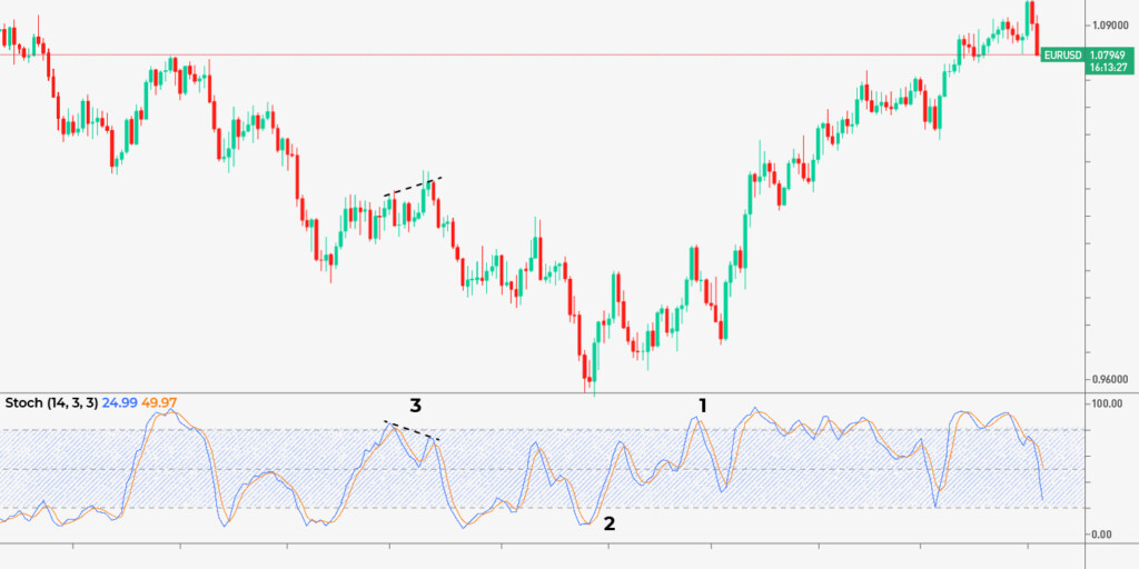 - Çakışma (Crossover): Gösterge iki çizgiden oluşur – %K ve %D. %K %D’nin altına düştüğünde satış sinyali verir (1). Aksine, %K %D’nin üzerine çıktığında alış sinyali verir. Sinyal sırasıyla aşırı alım ve aşırı satım bölgelerinde daha güçlüdür.