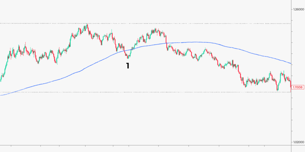 Fiyat, yukarıdaki resimde (1) olduğu gibi mevcut eğilime geri dönebilse de, fiyat SMA ile etkileşime girer girmez bir trend değişikliği bekleyebilirsiniz.