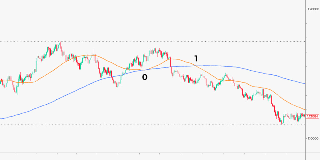 Aşağıdaki grafik, 50 günlük MA’nın 200 günlük MA’nın (1) altına düştüğünde, düşüş eğiliminin yürürlüğe girdiğini göstermektedir. Daha önce bir ölüm kesişimi olabilir (0), ancak 50 günlük MA, 200 günlük MA’nın altına düşmedi.