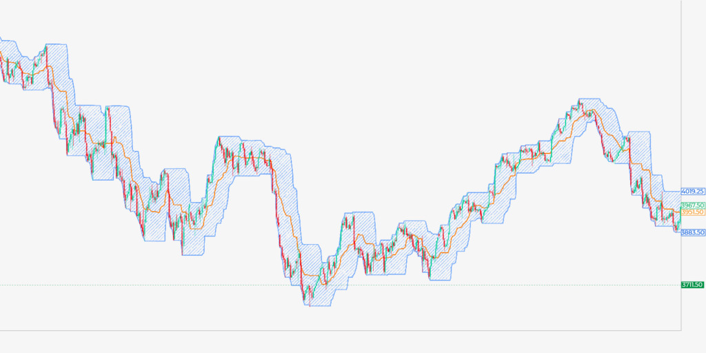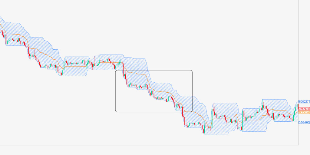 You can think of it like this: when trends are strong, like in the example above, they will put in highs or lows greater than the last 20 periods. As price moves to its lowest point in the previous 20 periods, the lower bound will continuously move down, indicating that there’s a strong bearish trend and vice versa.