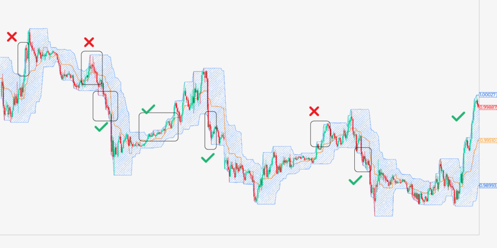 For example, you shouldn’t use Donchian channels to determine a bearish trend. Instead, you should identify a potential bearish trend with your own eyes, then use a Donchian channel as confirmation.